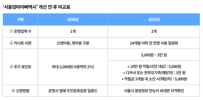 2025년부터 더욱 개선된 ‘서울엄빠택시’는 영아를 동반한 외출이 많은 가정에 실질적인 도움을 줄 수 있는 서비스입니다. 특히 올해부터 운영사가 2개로 늘어나 선택권이 확대되고, 추가 포인트 지급 및 신청 절차 간소화 등의 변화가 적용되었습니다.