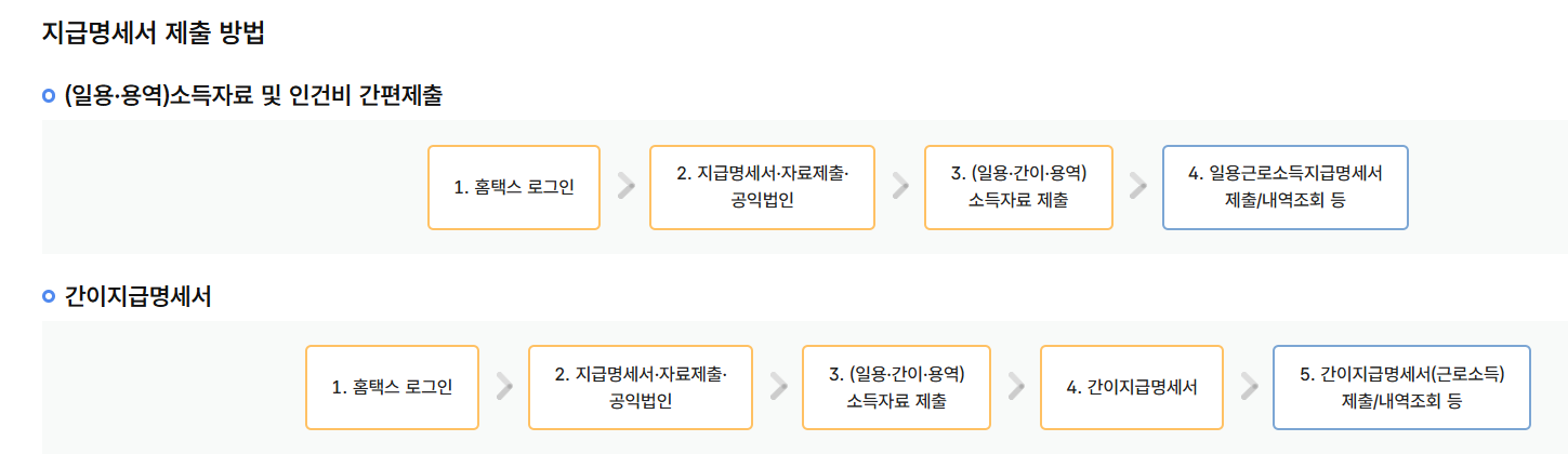 로그인 후 상단 메뉴에서 ‘조회/발급’을 클릭한 뒤, ‘지급명세서 등 조회’ 항목을 선택합니다. 여기서 본인의 소득 관련 지급명세서를 확인할 수 있습니다.
