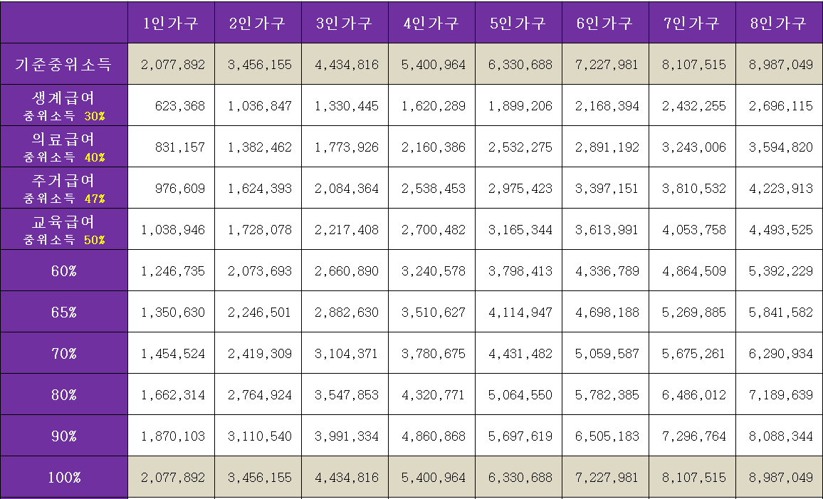 여기서 중위소득이란 대한민국 소득 중간값으로서, 매 년 물가상승률 및 가구원 수에 따라 달라집니다. 기준 중위소득과 그에 따른 혜택은 이와 같습니다.