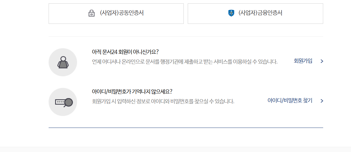 문서24시는 비회원 로그인 기능도 제공하고 있어, 공동인증서만 있다면 회원가입 없이도 문서 제출이 가능합니다. 단, 비회원 이용 시에는 일부 기능(문서 보관 이력, 즐겨찾기 등)이 제한될 수 있으며, 향후 자주 사용하는 분이라면 회원가입 후 이용하는 것을 추천드립니다.