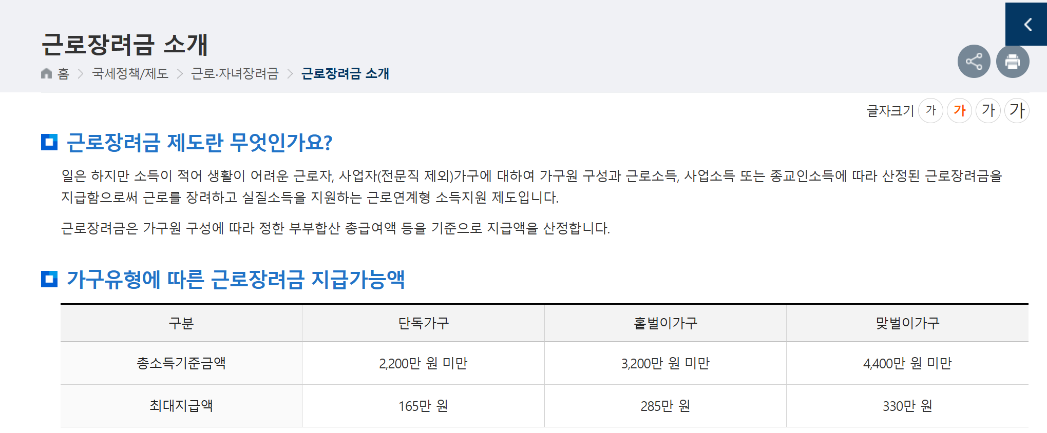 근로장려금 지급액 기준