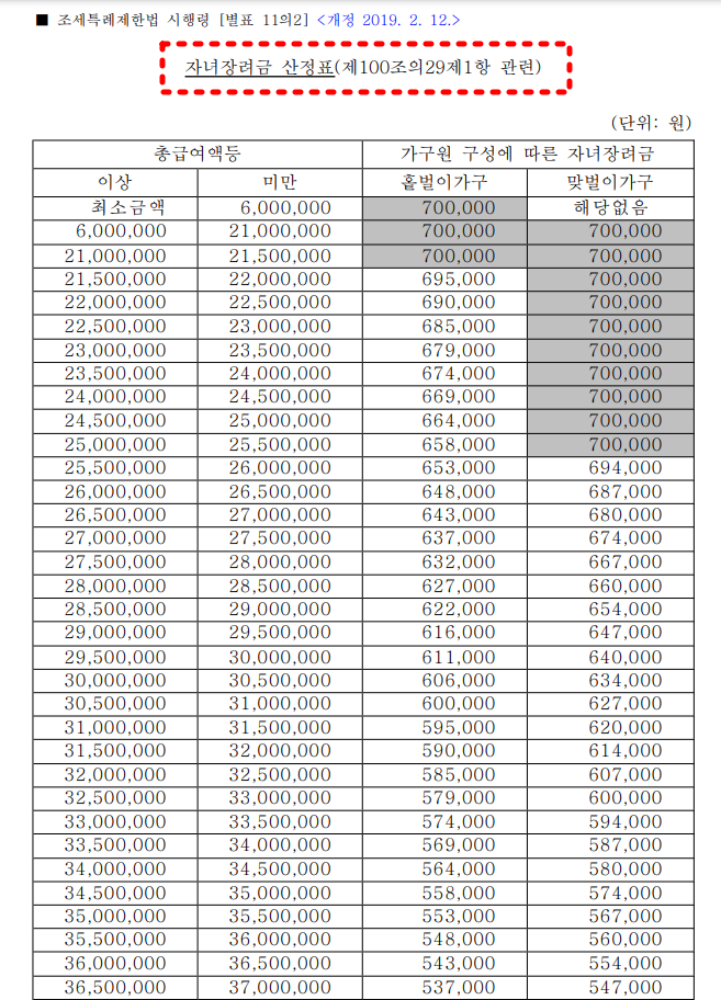 ※참고 (자녀장려금 산정표)