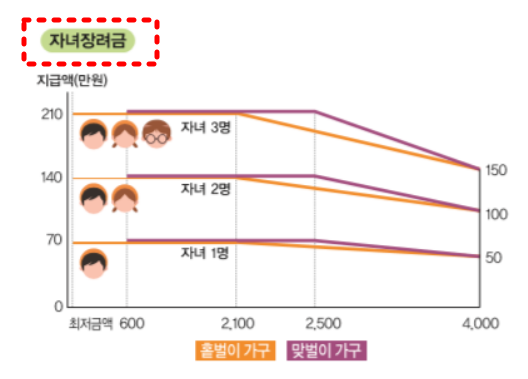 | 최대지급액 | 자녀 1인당 80만원 (최소 50만원 | ||