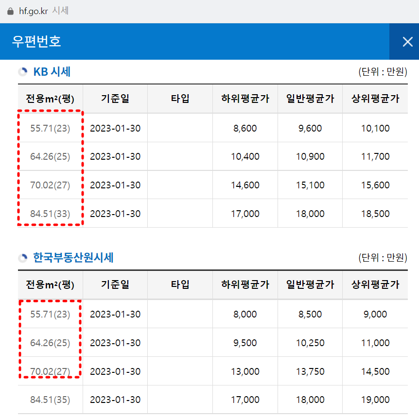 주소를 입력하면 이렇게 시세가 나오는데요 본인이 해당하는 평수를 클릭해주면 금액이 자동으로 기재가 됩니다.