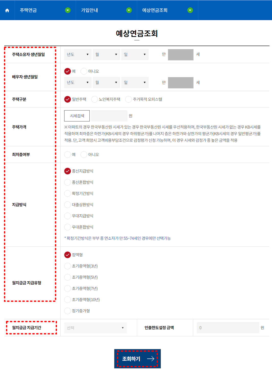 선택하는 옵션이 많으므로 궁금한 부분은 하나씩 바꿔가면서 '조회하기'를 눌러보면 좋습니다. 어떤 방식이 가장 유리할지 조회를 통해 알아보시면 도움이 되겠습니다.