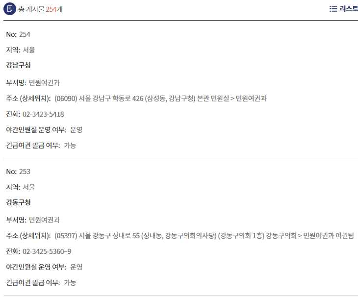 외교부 홈페이지에서 지역을 검색하면 접수처 정보와 함께 야간민원실 운영 여부, 긴급여권 발급 여부까지 한번에 조회가 가능합니다.