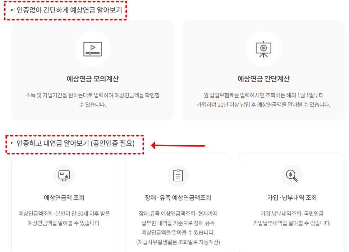 홈페이지에 접속하면 두 가지 방법이 나오는데요, 본인인증없이 간단하게 예상연금을 알아보는 방법과 '본인인증 후 정확한 금액을 알아보는 방법'이 있습니다.