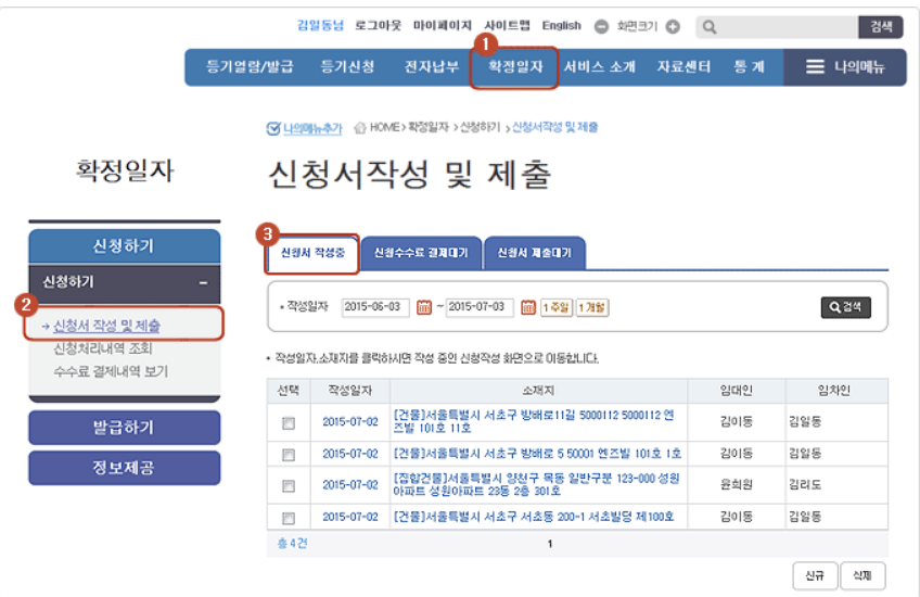 신청서 작성 및 제출에서 새로운 확정일자를 받기위한 신청서를 작성합니다.