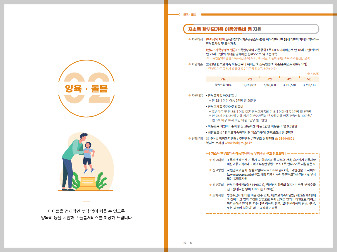 인터넷 검색을 통해 한부모가정 지원혜택을 찾아보는 것도 좋지만 여성가족부에서 만든 2023년 한부모가족 복지서비스 종합안내서를 참고하시면 더 편리할 것 같습니다. 카테고리별로 지원정책과 자격요건, 내용등이 잘 정리되어 있습니다.