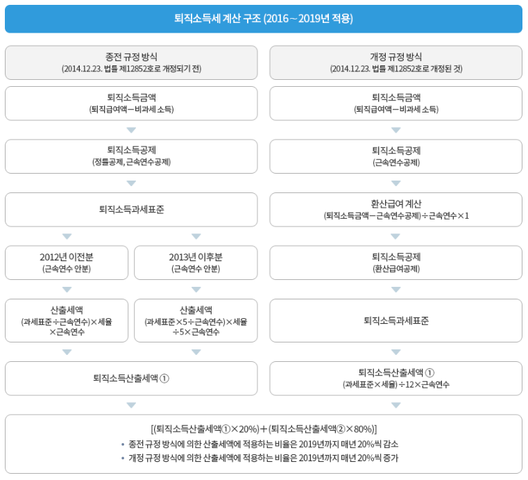2016년 1월 1일 이후에는 개정된 소득세법에 따라 퇴직소득을 계산합니다. 근속연수가 2015년 12월 31일 이전과 이후로 나누어져 있으며, 각각에 대해 퇴직소득과세표준을 따로 계산합니다. 이후, 각각에 대해 세액을 계산한 후, 연도별 적용비율을 반영하여 최종 세액을 산출합니다.